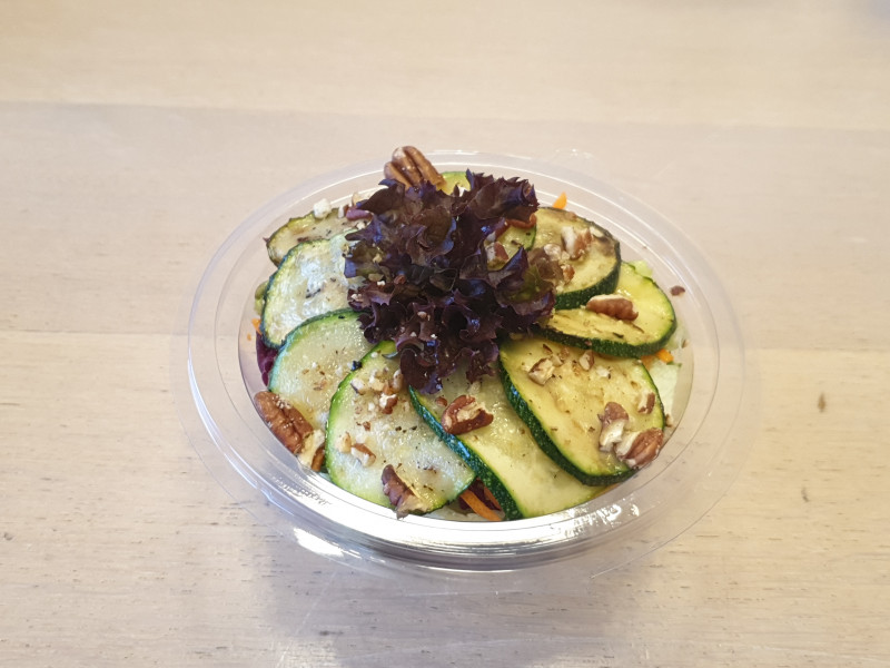 De groene salade is samengesteld uit diverse slasoorten, groente en kruiden, met als topping gegrilde courgette.