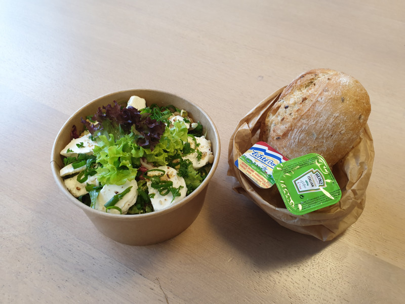 Onze maaltijdsalade wordt gemaakt van diverse geplukte slasoorten, aangemaakt met Pomodori tomaat, komkommerblokjes, zwarte olijfringetjes en groene kruiden. De salade wordt geserveerd met een cupje dressing, passend bij de salade en een speltbroodje met roomboter.